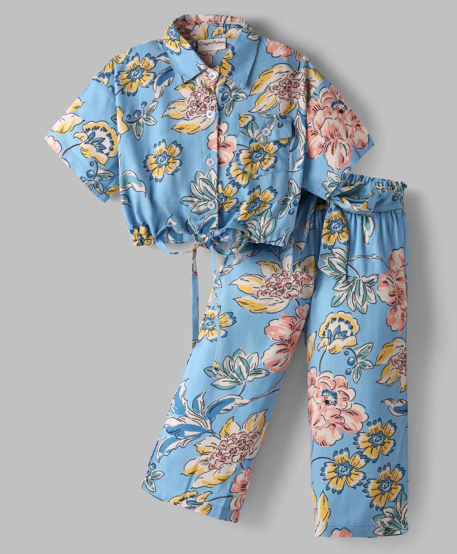Floral Printed Crop Collar Top Belted Palazzo Set